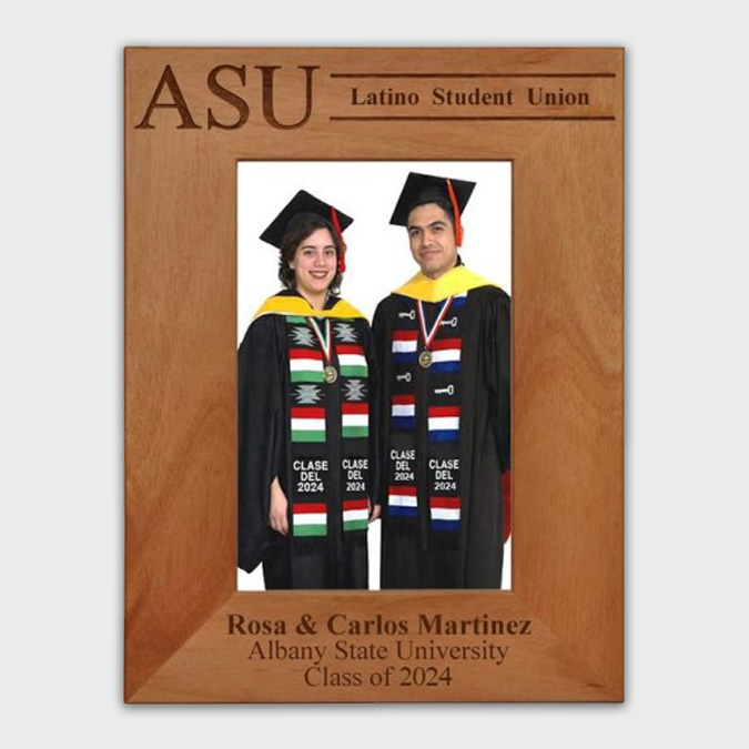 Display the pride in both your academic achievement and fraternity or sorority. Capture and cherish the highlight of one’s scholastic achievement while adding elegance and character to the home or office. The perfect keepsake for any graduate, alumni, co-worker or colleague. Personalize these wooden picture frames with laser engraved College's initials, Greek letter organization's name at the top and receipient's name and class or graduation date at the bottom.