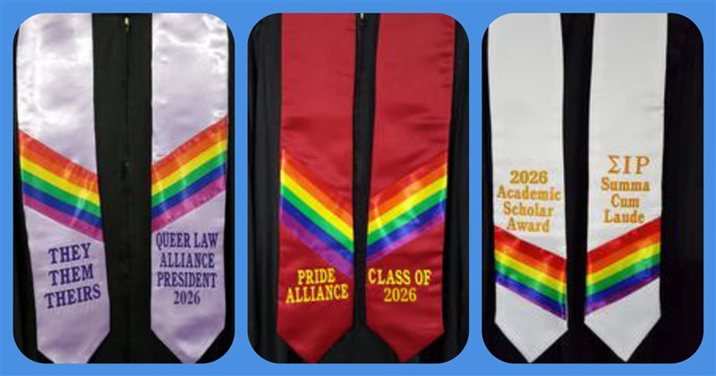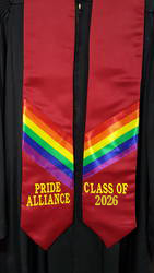 Each satin stole is custom tailored and accented with silk rainbow swatches.