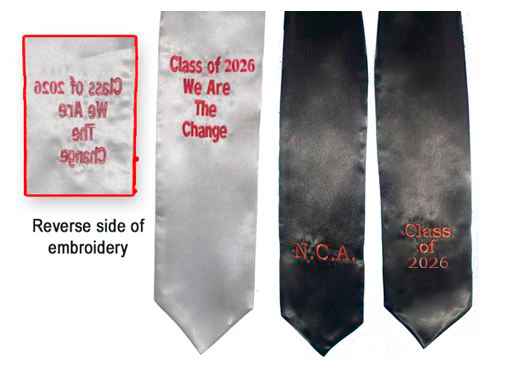 NOTE: Please note that the embroidery is done on pre-sewn stoles, so embroidery threads are visible on the reverse side of the stole. The embroidery threads will not be visible when worn over a graduation robe., if you want stole sewn from scratch, in which case we will sew a back panel to cover the embroidery threads, there will be an extra $15.00 charge. Make your selection in the product builder/customizer.