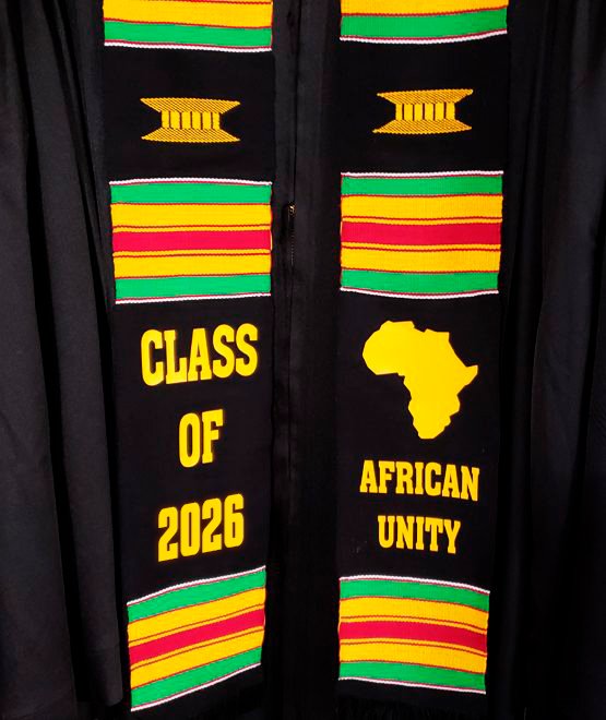 K8: Red kente stole with gold stripes and Asante Adrinkra symbol for symbol of democracy and oneness despite cultural differences.